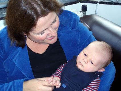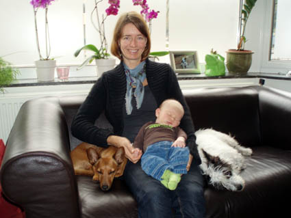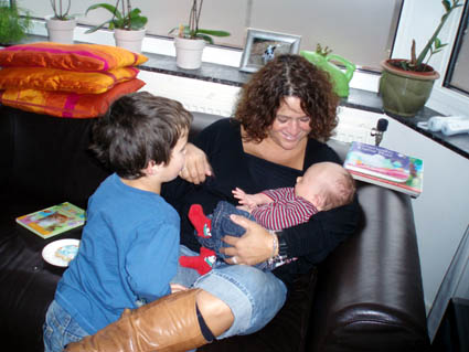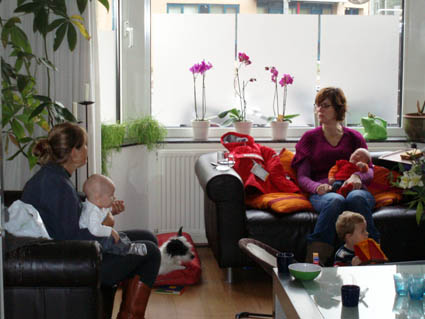 | In november kwamen er veel mensen op bezoek. Ze brachten cadeautjes mee, omdat ik geboren ben. Pascalle kwam niet van zo ver. Ze woont boven ons. Met Frank. En met Sven en Jamie. Dat is een tweeling. |
