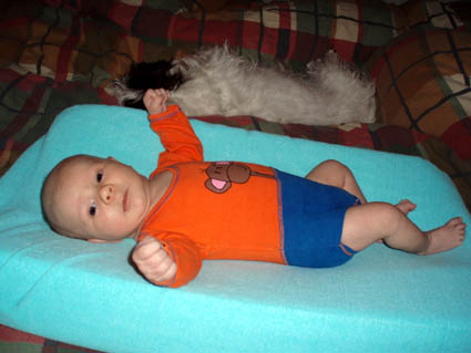 Soms komen er baby's op bezoek. Dit is Kick. Hij is wat ouder dan ik ben, want hij kan al op schoot zitten. Bij zijn moeder Melanie. | |